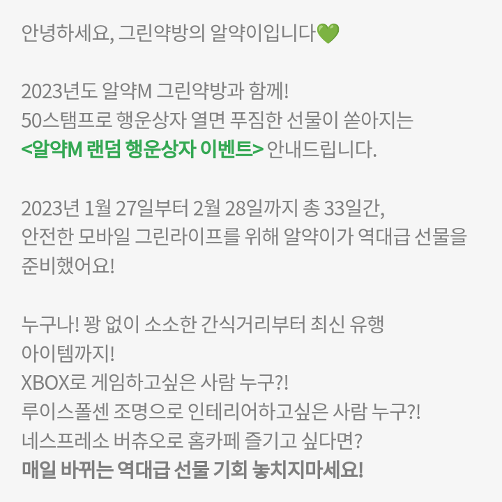 알약M 그린약방에서 매일매일 알약 적립하고 더 많은 랜덤 행운상자 열어보세요.
