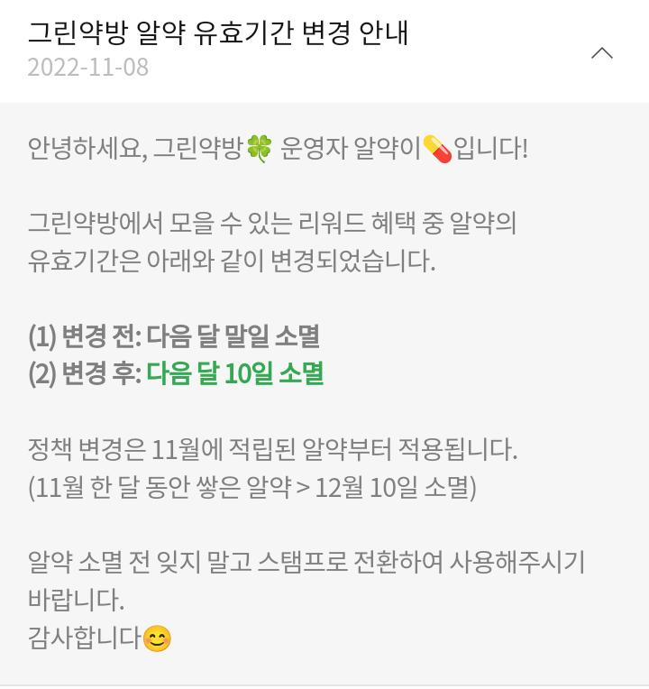 - 알약은 적립일 기준으로 다음달 10일 소멸된다.