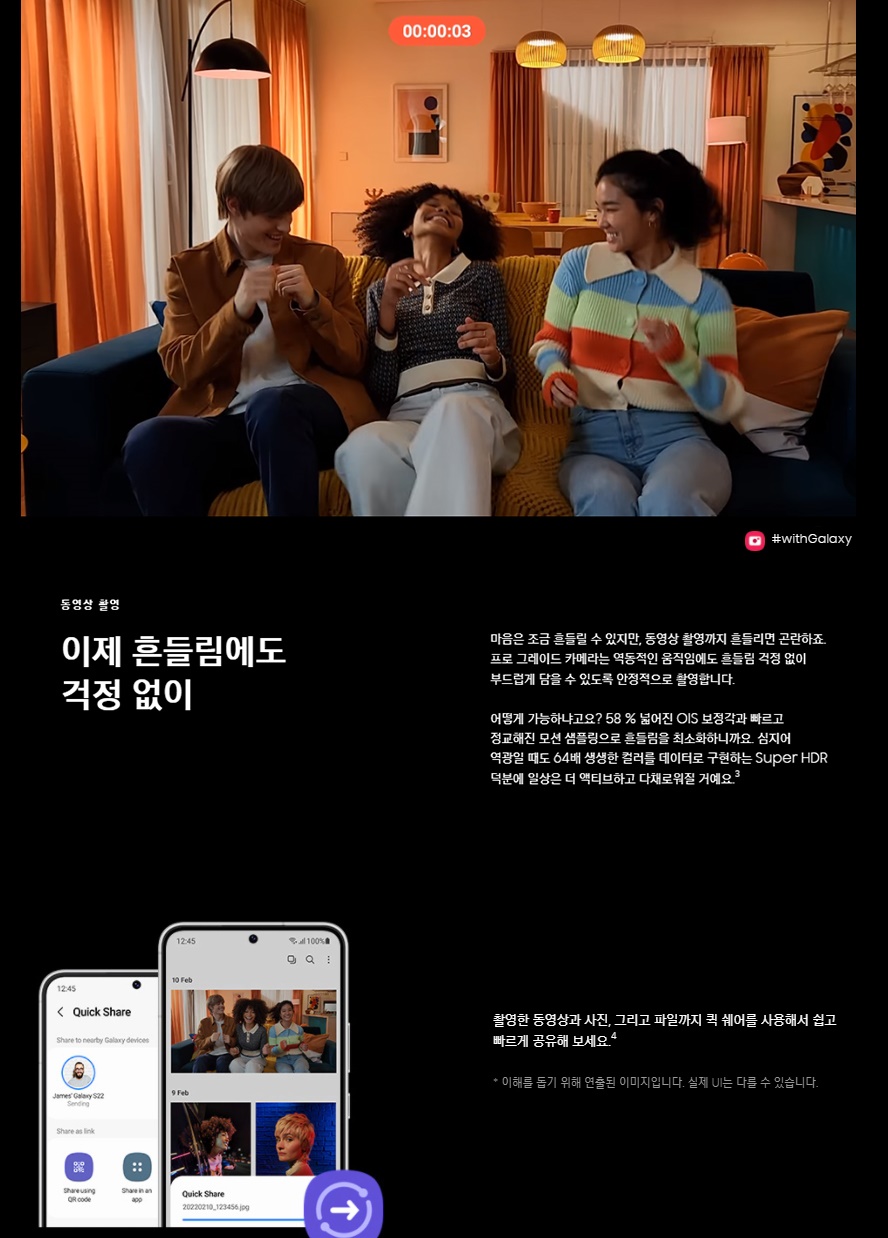 58% 넓어진 OIS 보정각과 빠르고 정교해진 모션 샘플링으로 흔들림을 최소화하니까 가능하다. 심지어 역광일 때도 64배 생생한 컬러를 데이터로 구현하는 Super HDR 덕분에 일상은 더 액티브하고 다채로워질 것이다.