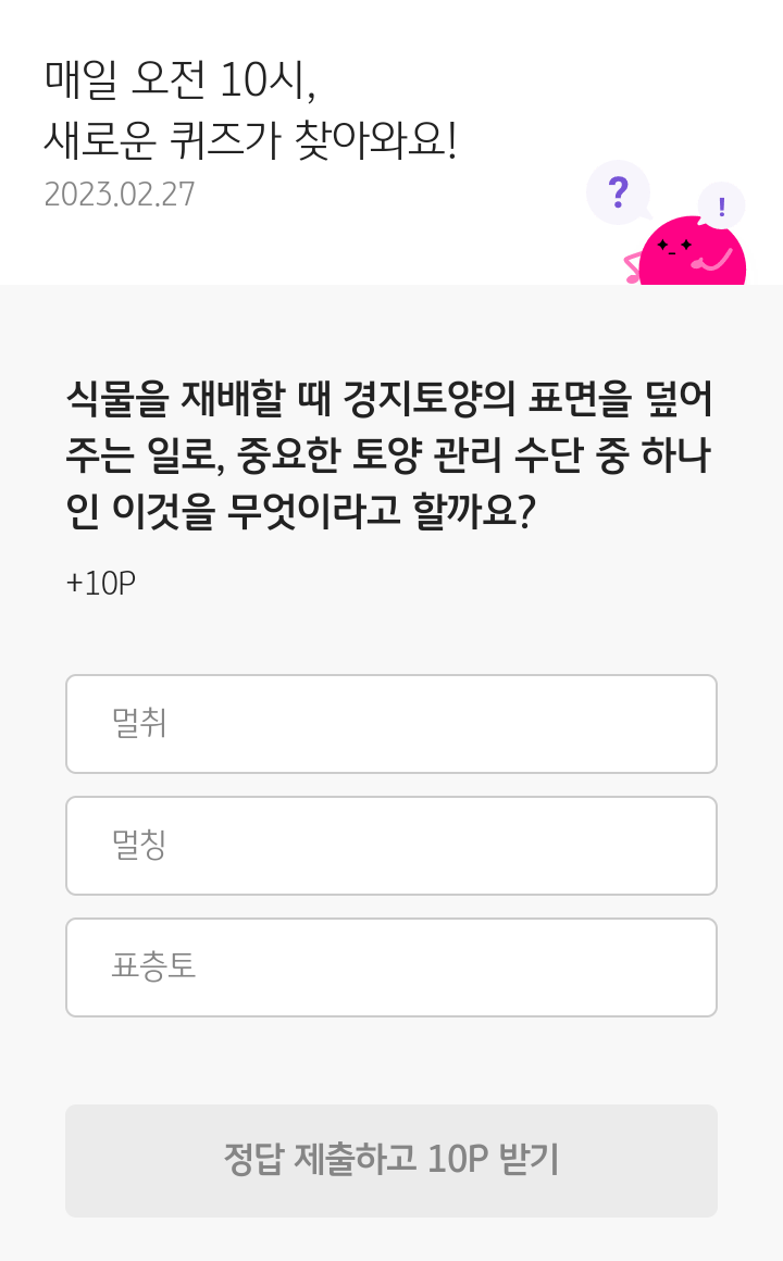 KB Pay 오늘의 퀴즈(23.02.26), 퀴즈정답, 식물을 재배할 때 경지토양의 표면을