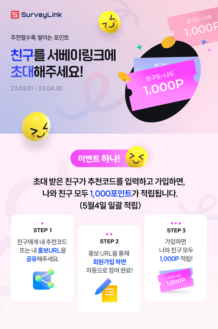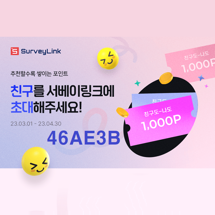 서베이링크(surveylink) 친구초대 이벤트가 진행중이다. 초대받은 친구가 초대코드를 입력하고 가입하면 나와 친구 모두에게 1000P가 적립된다.