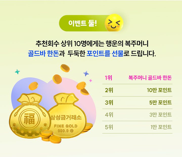 - 추천회수 상위 10명에게는 행운의 복주머니 골드바 한돈과 두둑한 포인트를 선물로 지급한다.