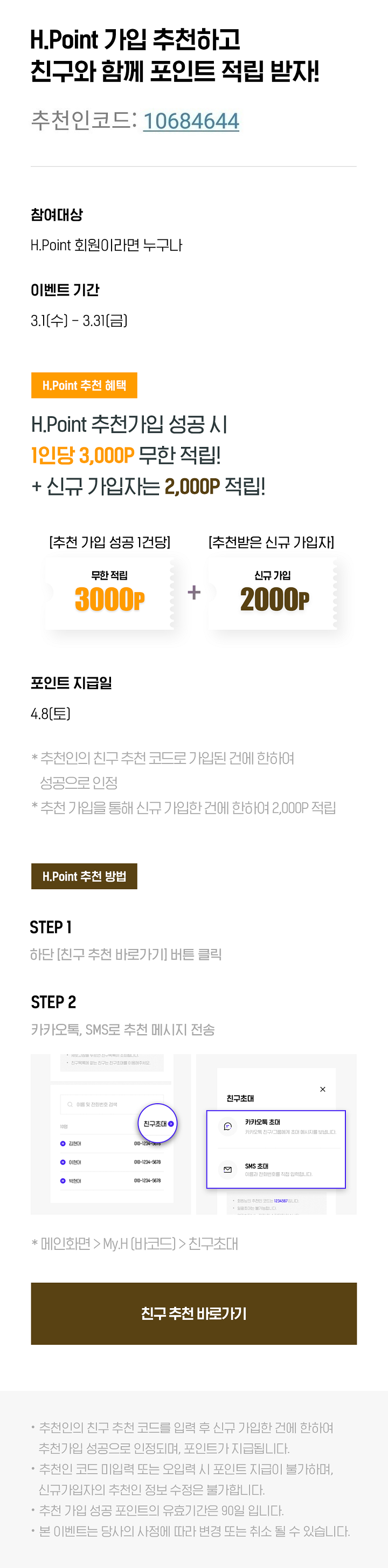 - H.Point 추천가입 성공 시 1인당 3000P 무한 적립! + 신규 가입자는 2000P 적립!