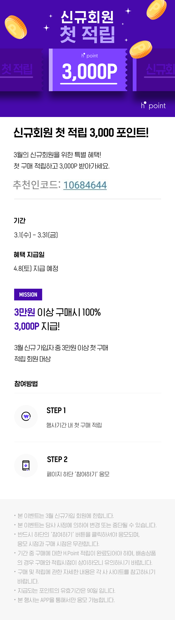 회원가입시 추천코드를 입력하면 2000P 지급되고, 3월 신규가입자는 첫구매 미션달성시에 3000P가 적립된다. 광고 PUSH 최초 동의하면 2000P 추가 적립되고, H.Point 친구 추천 성공시 마다 1인당 3000P씩 무한 적립받을 수 있다.