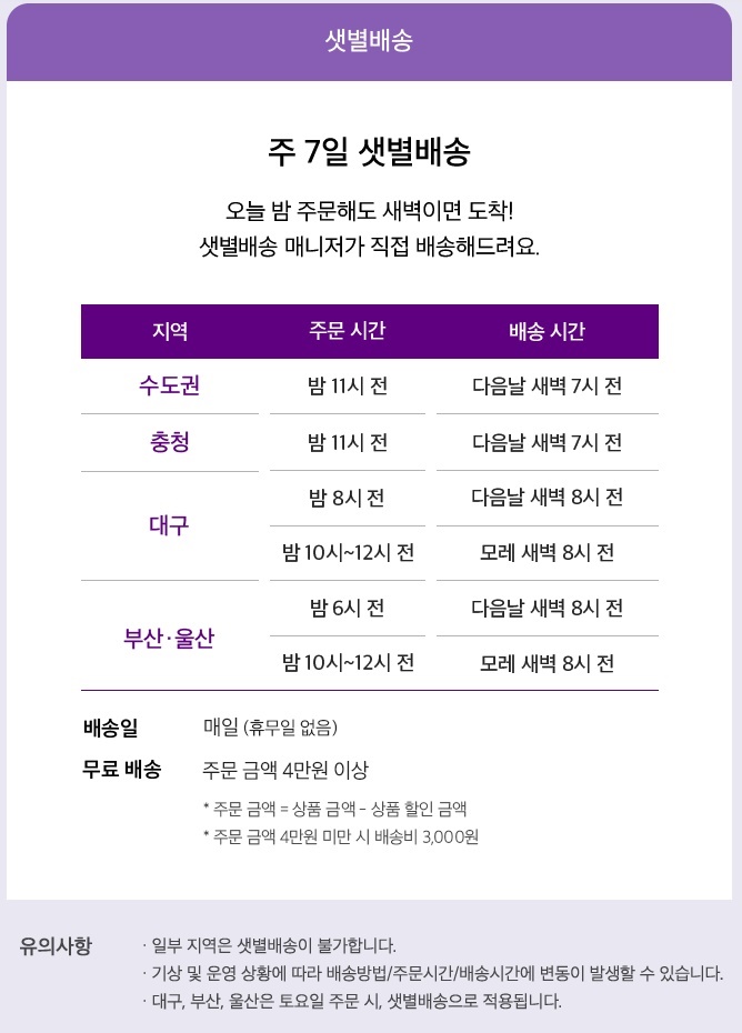 - 수도권, 충청, 대구, 부산, 울산, 그외지역으로 나눠지고, 지역별 주문시간에 따라 배송시간의 차이가 있다.