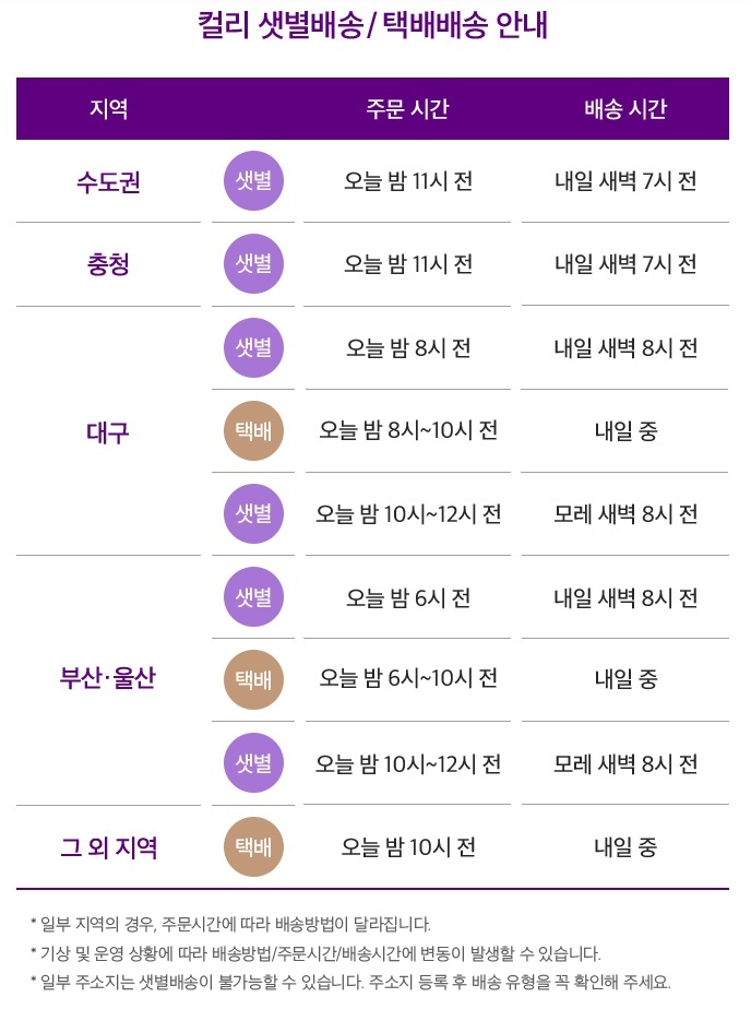 컬리에서는 배송 배송지역에 따라 샛별배송과 택배배송으로 나눠진다. 수도권, 충정 지역은 밤 11시까지 전까지 주문을 완료하면 다음날 새벽 7시 전에 집으로 배송 받을 수 있다. 대구, 부산, 울산 지역은 주문 시간에 따라 배송시간이 달라지고, 그 외 지역에서는 택배배송으로 받아볼 수 있다.