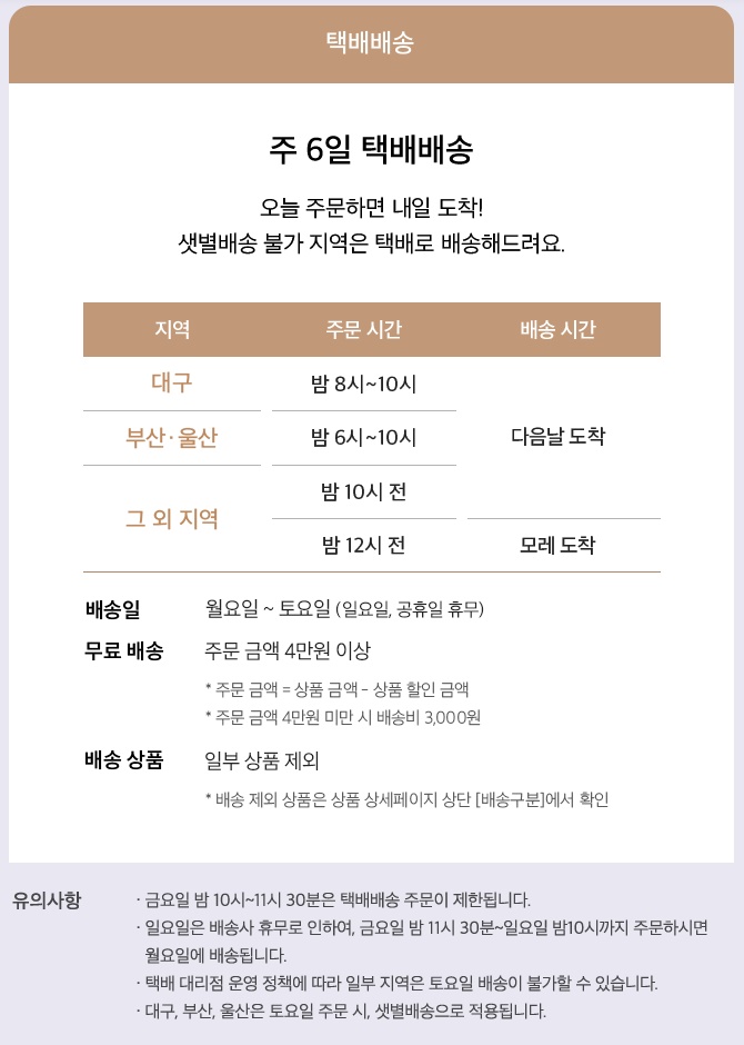 * 금요일 밤 10시~11시 30분은 택배배송 주문이 제한된다.