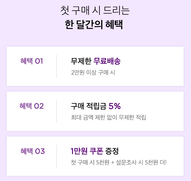 혜택3) 1만원 쿠폰 증정, 첫 구매시 시 5천원 + 설문조사 시 5천원 더!