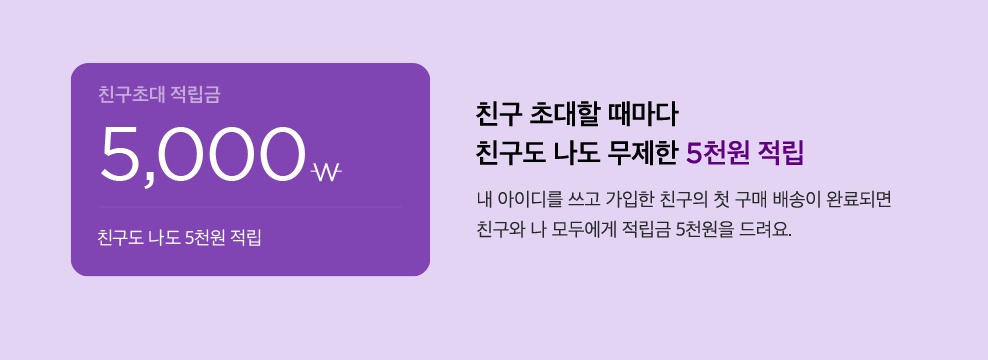 * 친구 초대할 때마다 친구와 나 모두에게 적립금 5천원을 지급한다.