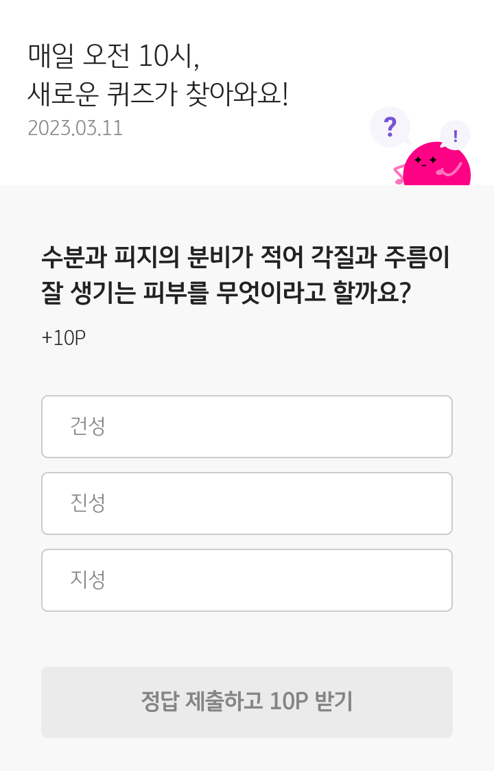 KB Pay 오늘의 퀴즈(23.03.11), 퀴즈정답, 수분과 피지의 분비가 적어