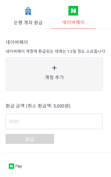 - 환급은 은행계좌 또는 네이버페이로 받을 수 있다. 은행계좌와 증권계좌 모두 사용가능하고, 최소 환급액은 5000원이다.