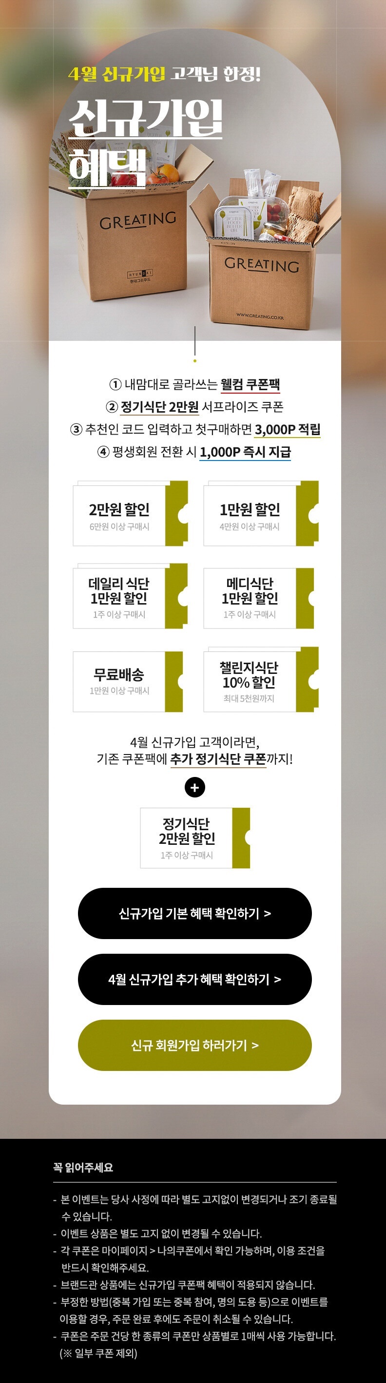그리팅에서 신규 회원가입 이벤트를 진행중이다. 신규로 가입한 회원에게는 10만원 쿠폰팩이 지급되고, SMS수신동의(1000P), 이메일 수신동의(1000P), 건강정보 수신동의(1000P) 선택하면 3000스푼(포인트)이 적립된다. 또 신규회원은 인기상품 4종(① 정성담 갈비탕, ② 감바스 알아히요&파스타, ③ 한솔냉면 패키지, ④ 뚝배기 불고기) 중 1가지를 990원에 구입할 수 있다.