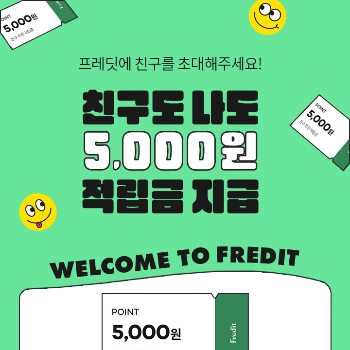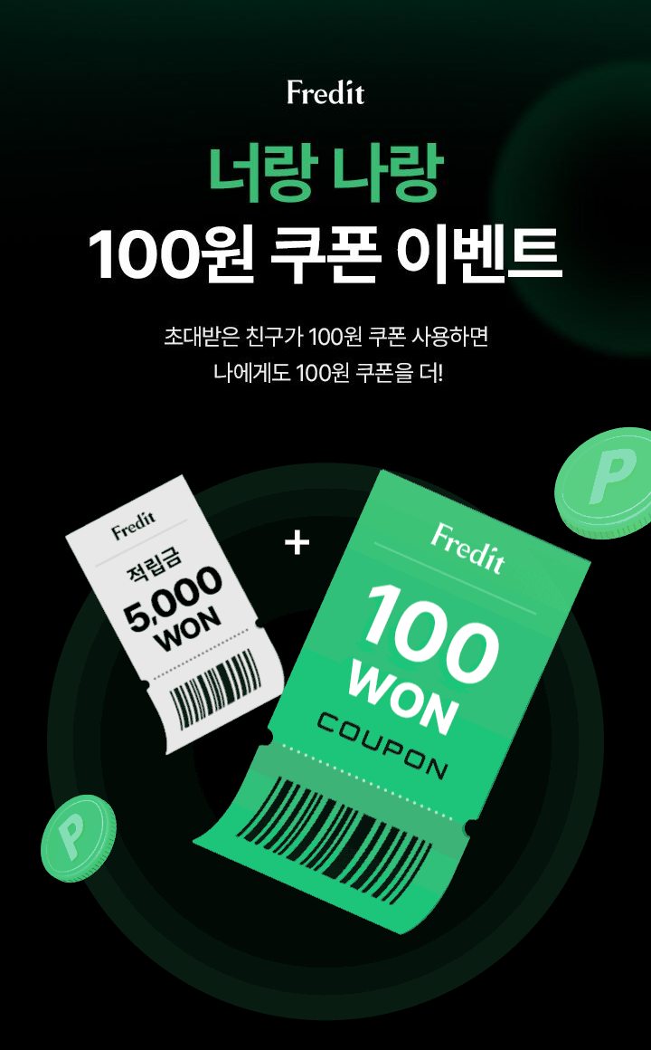 프레딧 친구추천 이벤트 참여하고 5,000원 적립금과 100원 쿠폰 받아가세요.