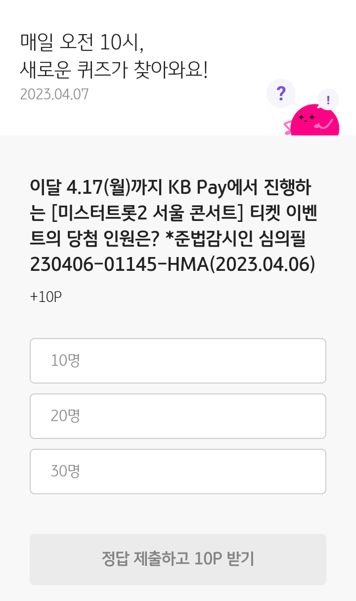 KB Pay 오늘의 퀴즈(23.04.07), 퀴즈정답, 미스터트롯2 서울 콘서트