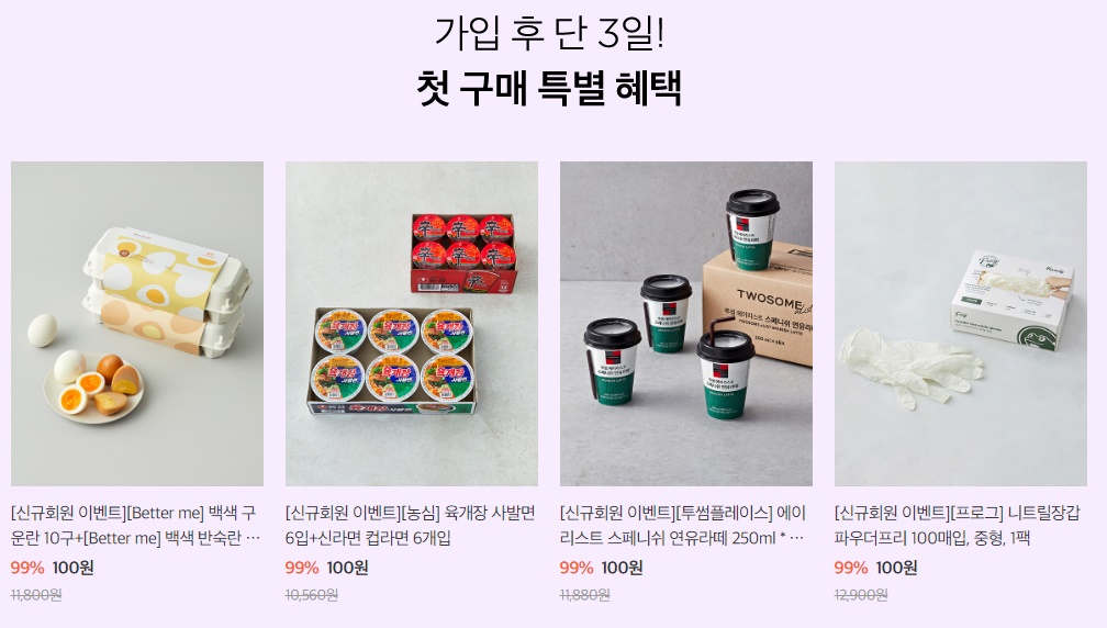 - 가입 후 단 3일 동안 인기상품을 100원에 구입할 수 있다.