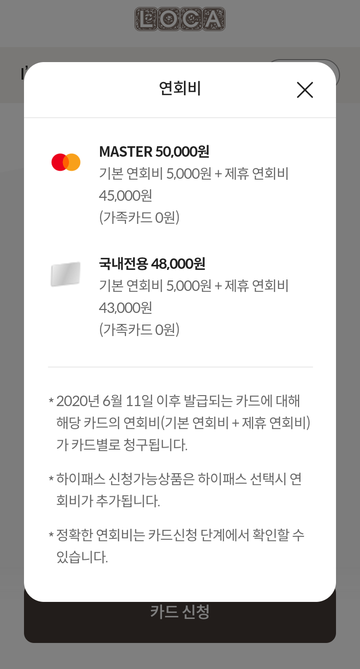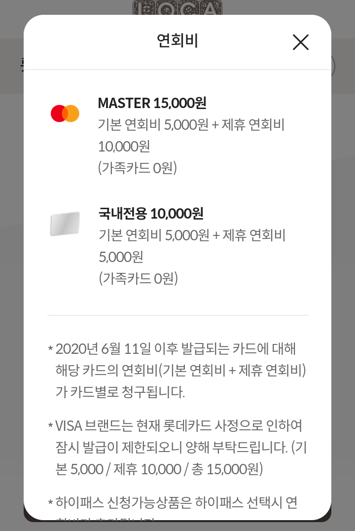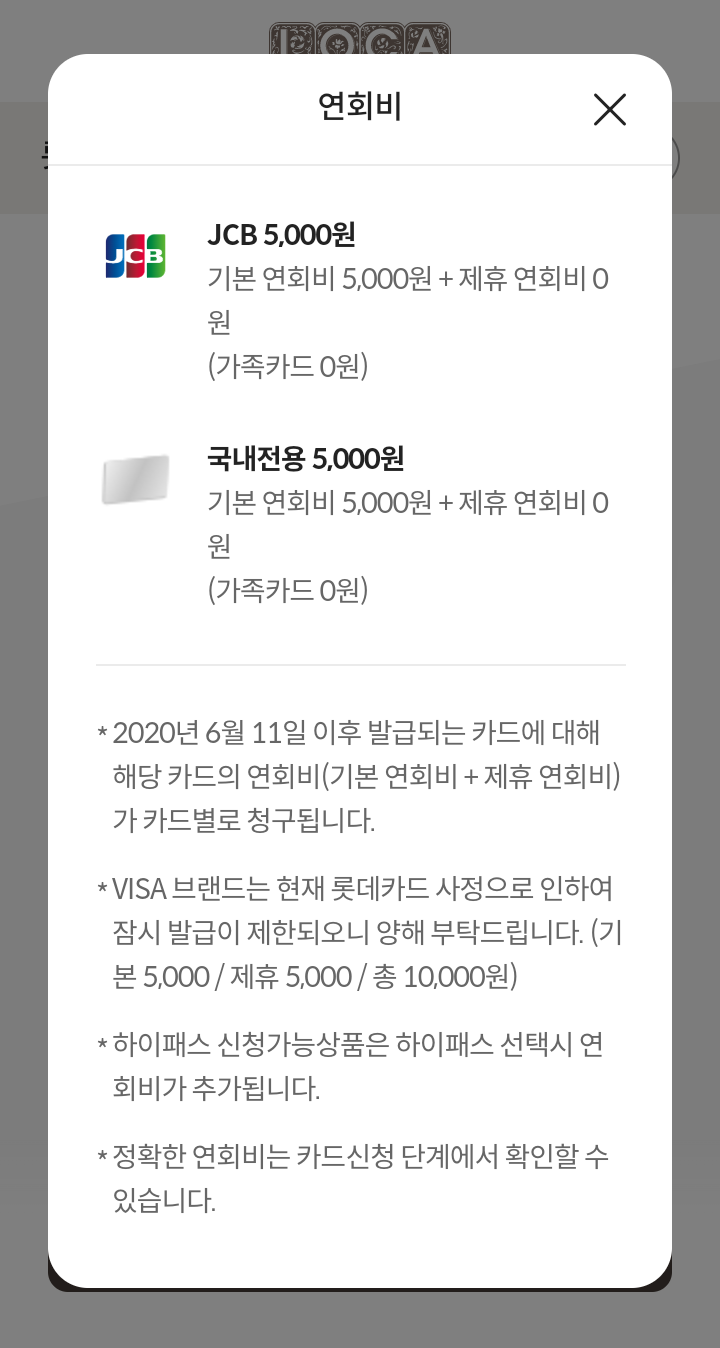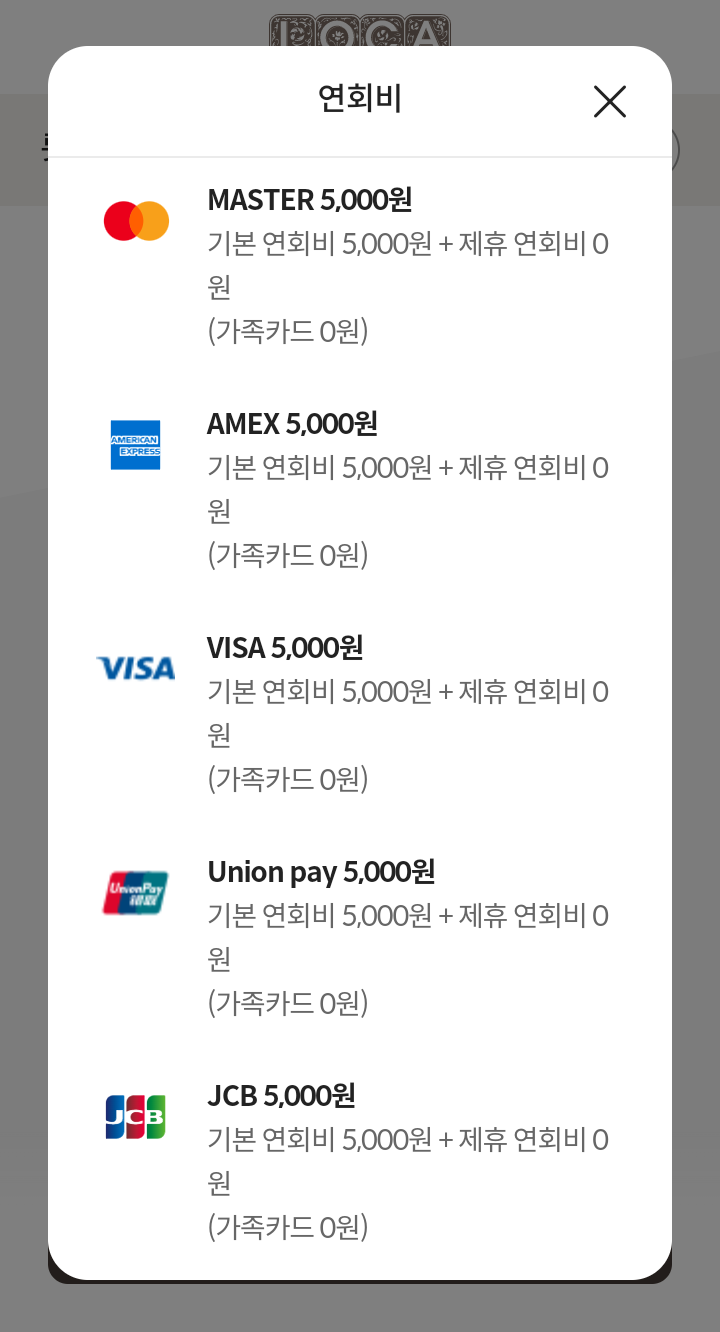- 해외겸용(MSATER, AMEX) 15000원(기본 5000원+제휴 10000원)(가족카드 0원)