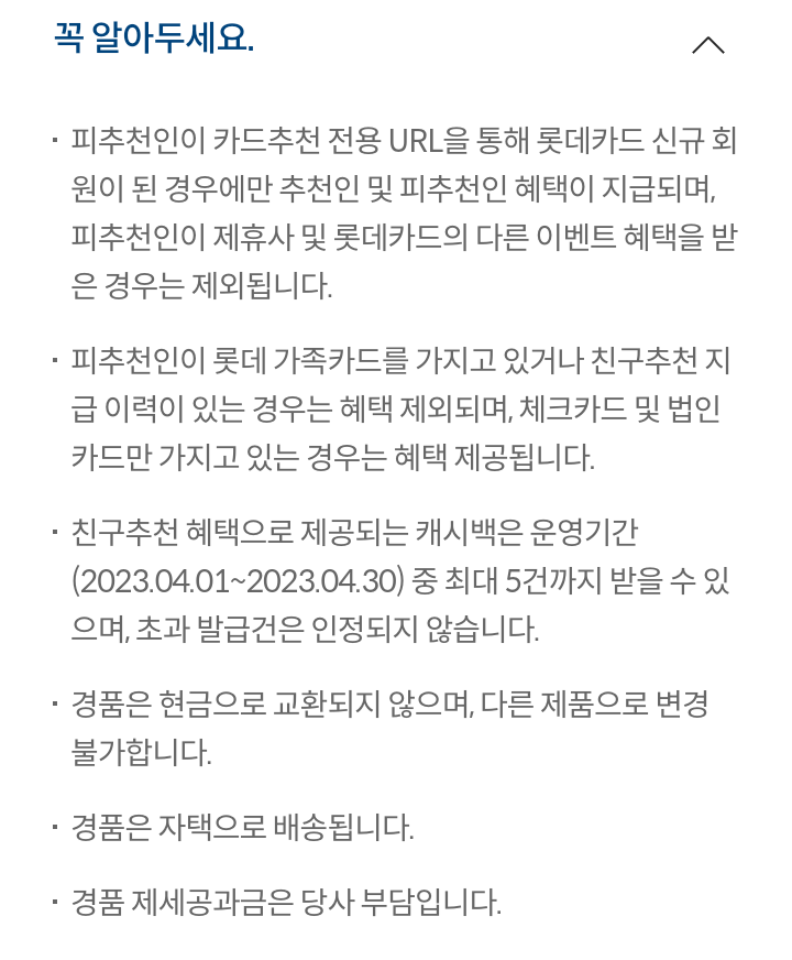 - 피추천인이 롯데 가족카드를 가지고 있거나 친구추천 지급 이력이 있는 경우는 혜택 제외되며, 체크카드 및 법인카드만 가지고 있는 경우는 혜택 제공된다.