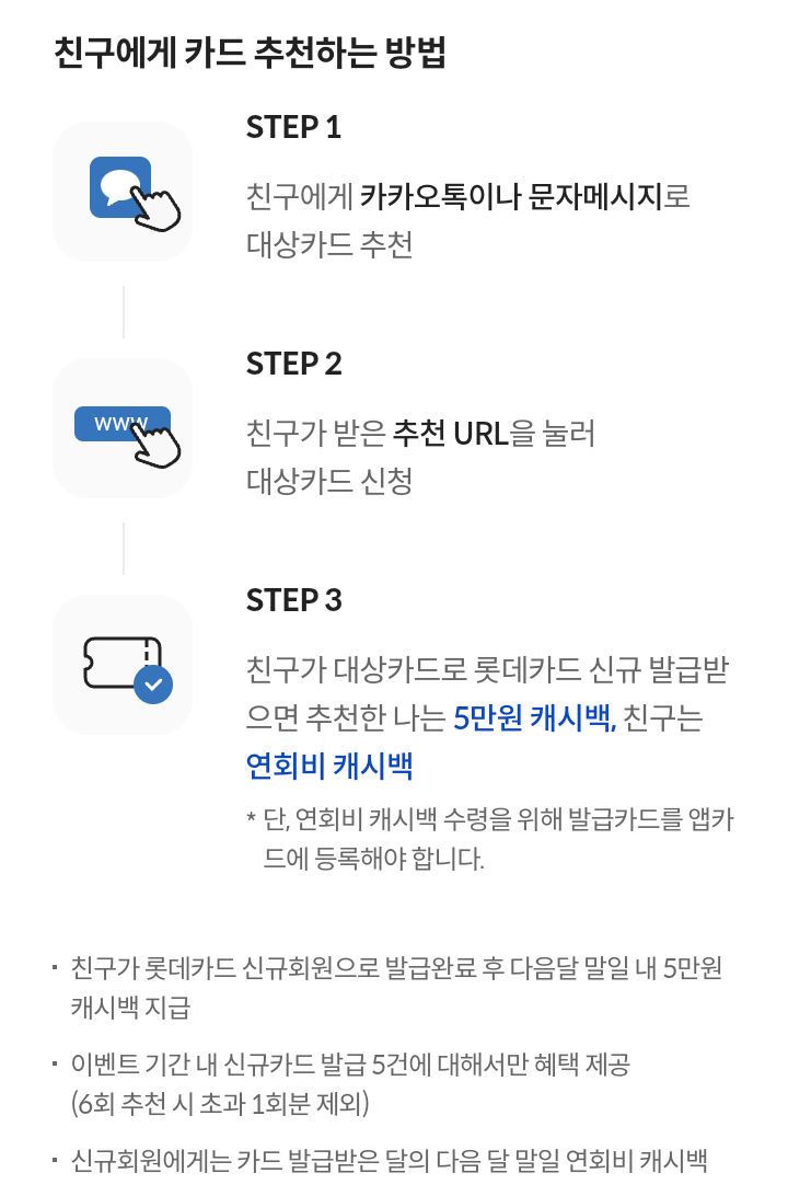- 피추천인이 카드추천 전용 URL을 통해 롯데카드 신규 회원이 된 경우에만 추천인 및 피추천인 혜택이 지급되며, 피추천인이 제휴사 및 롯데카드의 다른 이벤트 혜택을 받은 경우는 제외된다.
