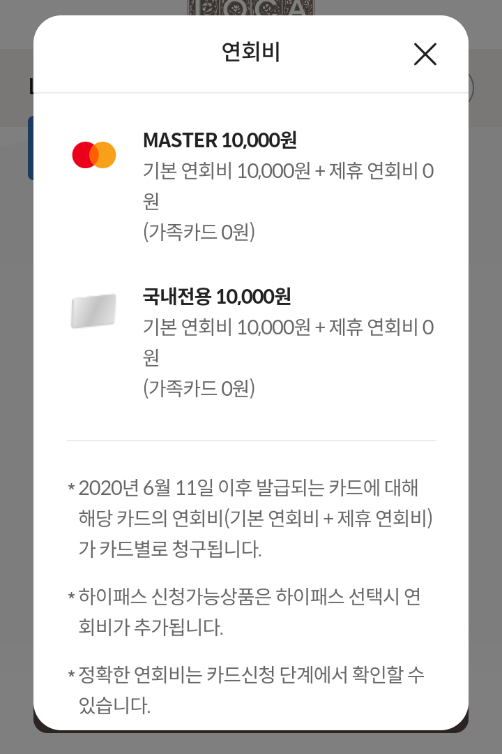 - 해외겸용(MSATER, AMEX) 10000원(기본 10000원+제휴 0원)(가족카드 0원)