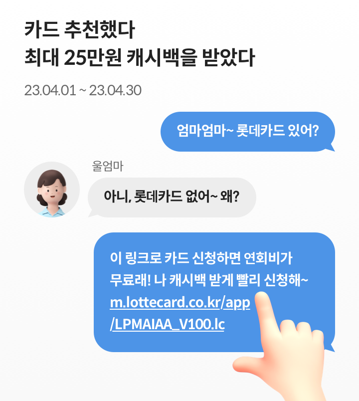 롯데카드에서는 추천 URL을 통해 가입하면 연회비 캐시백 해주는 이벤트를 진행 중이다.