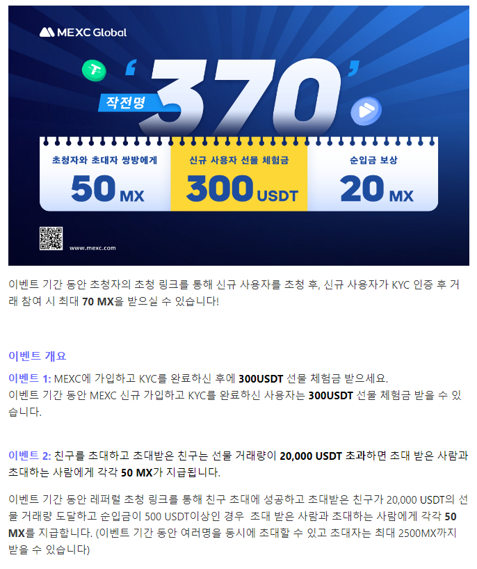 MEXC 작전명 '370' - MEXC 신규 사용자 초대 이벤트: 최대 70MX+ 300 USDT