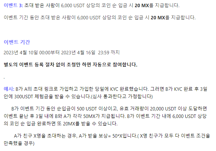 - 이벤트 기간 동안 초대 받은 사람이 6,000 USDT 상당의 코인 순 입금 시 20 MX를 지급한다.