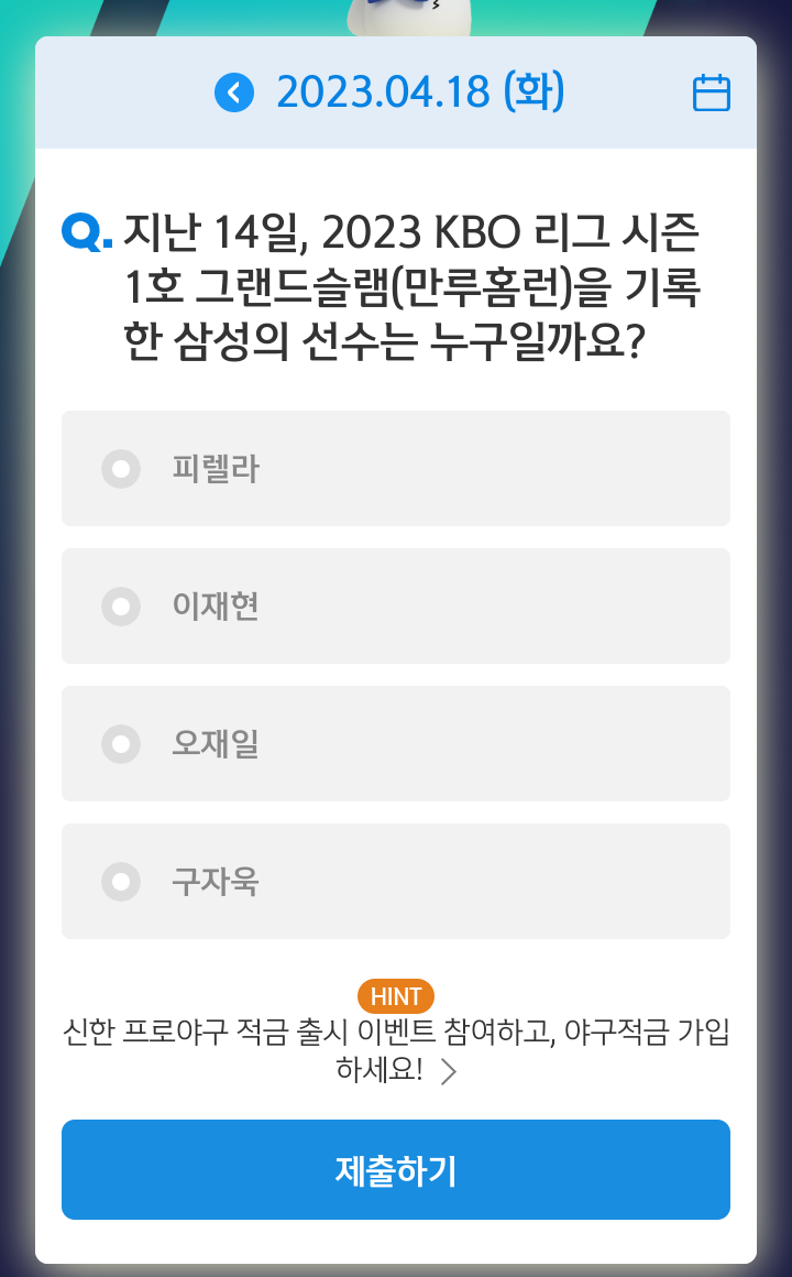 신한쏠, 야구상식 쏠퀴즈(23.04.18), 퀴즈정답, 시즌 1호 그랜드슬램(만루홈런)을 기록한