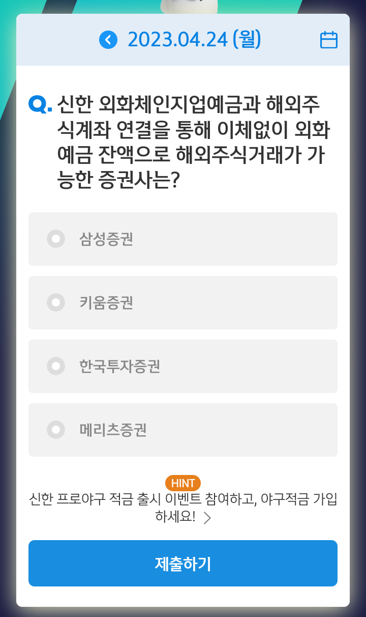 신한쏠, 야구상식 쏠퀴즈(23.04.24), 퀴즈정답, 신한 외화체인지업예금과 해외주식계좌