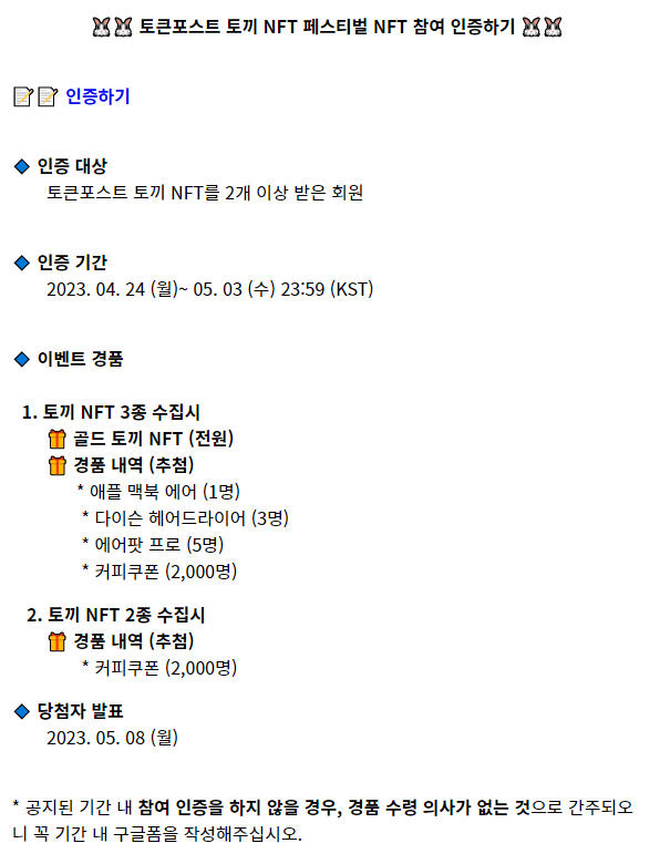 1차, 2차, 3차 토큰포스트 토끼NFT 페스티벌 이벤트의 미션을 2번 이상 완료한뒤 받은 NFT를 인증하면, 경품에 응모가 된다. 1개 이하의 NFT를 받았다면 이번 경품 대상자가 아니다.