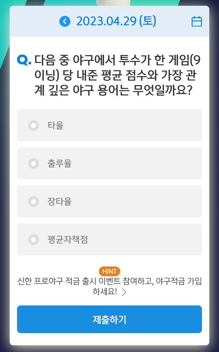 신한쏠, 야구상식 쏠퀴즈(23.04.29), 퀴즈정답, 투수가 한 게임(9이닝) 당 내준 평균 점수