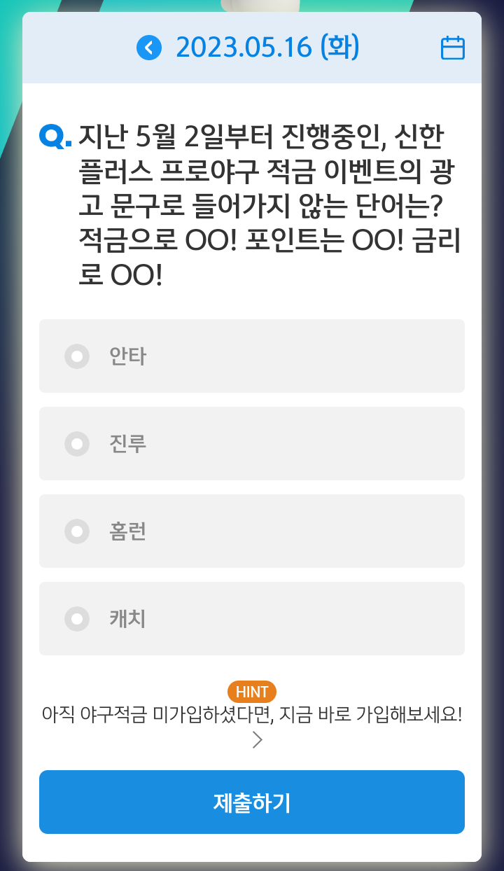 신한쏠, 야구상식 쏠퀴즈(23.05.16), 퀴즈정답, 신한 플러스 프로야구 적금 이벤트