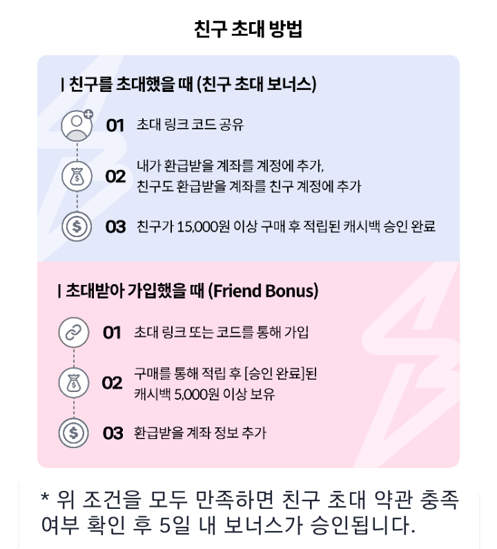 * 조건을 모두 만족하면 친구 초대 약관 충족 여부 확인 후 5일 내 보너스가 승인된다.