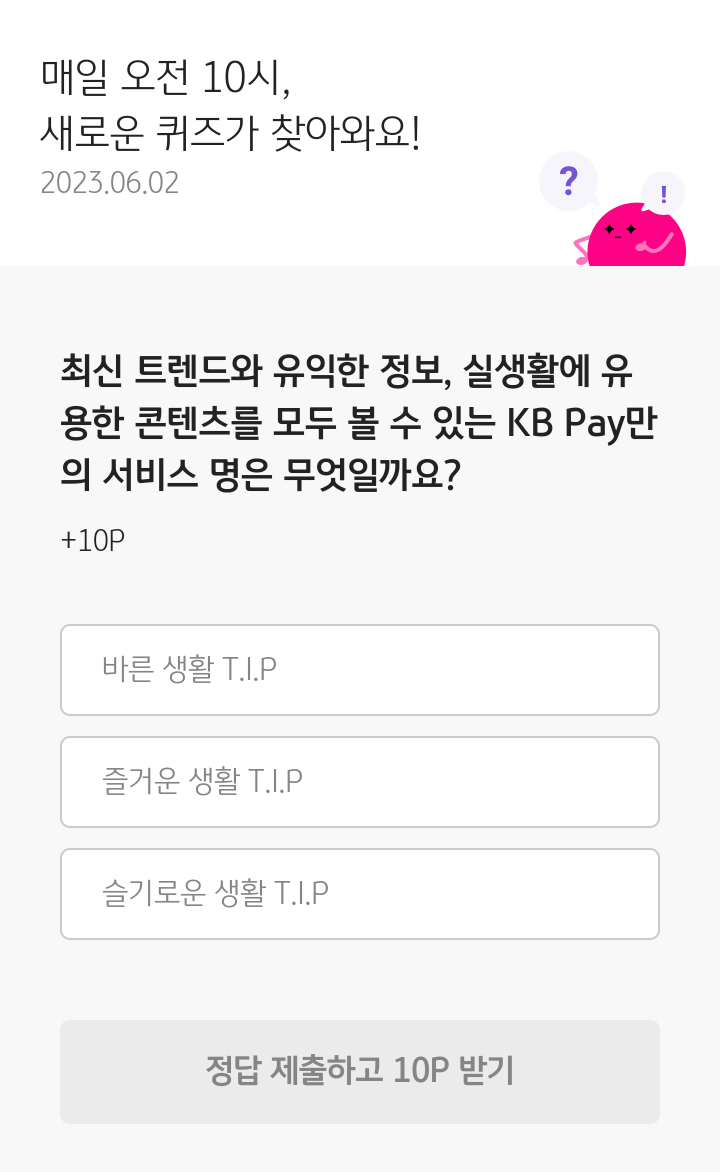 KB Pay 오늘의 퀴즈는 매일 오전 10시에 새롭게 찾아갑니다. 퀴즈 풀고 포인트 받아가세요.