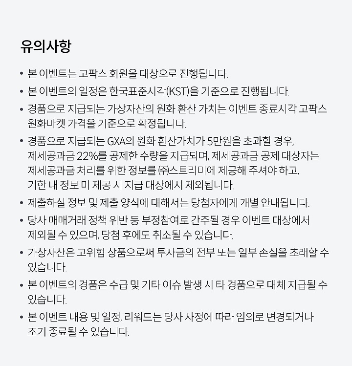 - 경품으로 지급되는 가상자산의 원화 환산 가치는 이벤트 종료시각 고팍스 원화마켓 가격을 기준으로 확정된다.