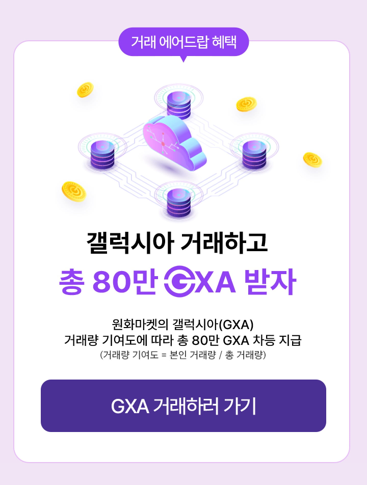 이벤트 기간 동안 거래 에어드랍(총 80만 GXA), 신규 가입 에어드랍(총 20만 GXA) 등 조건 충족시 갤럭시아(GXA)가 지급된다.