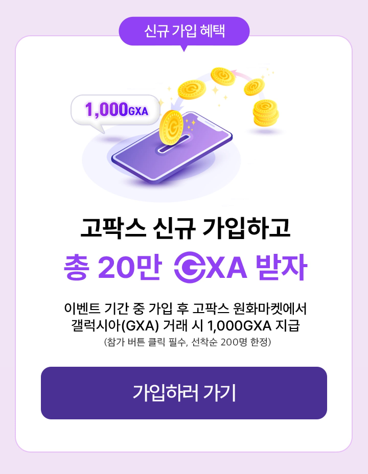 - 이벤트 기간 중 가입 후 고팍스 원화마켓에서 갤럭시아(GXA) 거래 시 1,000GXA 지급