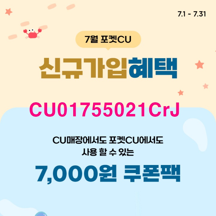 포켓CU 신규 회원에게는 7천원 할인 쿠폰팩이 지급된다. 포켓CU에 신규 가입단계에서 추천인 코드( CU01755021CrJ )를 입력하거나, 간편 회원가입 후 '추천코드 등록'에서 추천인 코드를 입력하면 된다.