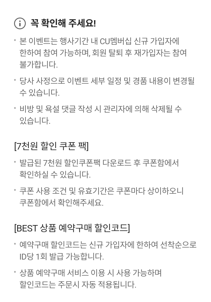 - 행사기간 내 CU 멤버십 신규 가입에 한하여 참여 가능하며, 회원 탈퇴 후 재가입자는 참여 불가하다.