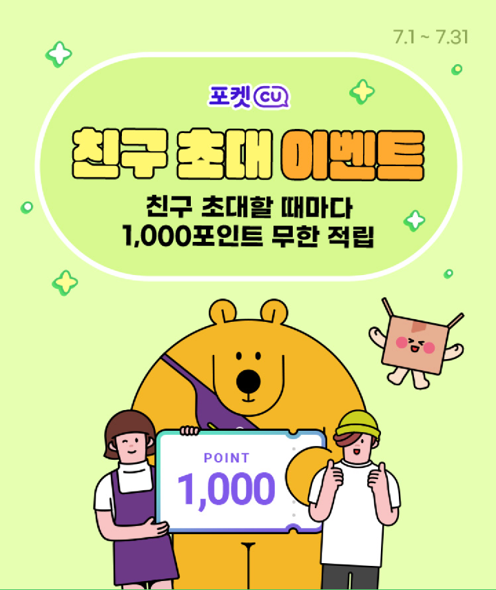 포켓CU에서 7월 신규가입 이벤트와 친구초대 이벤트를 진행중이다.