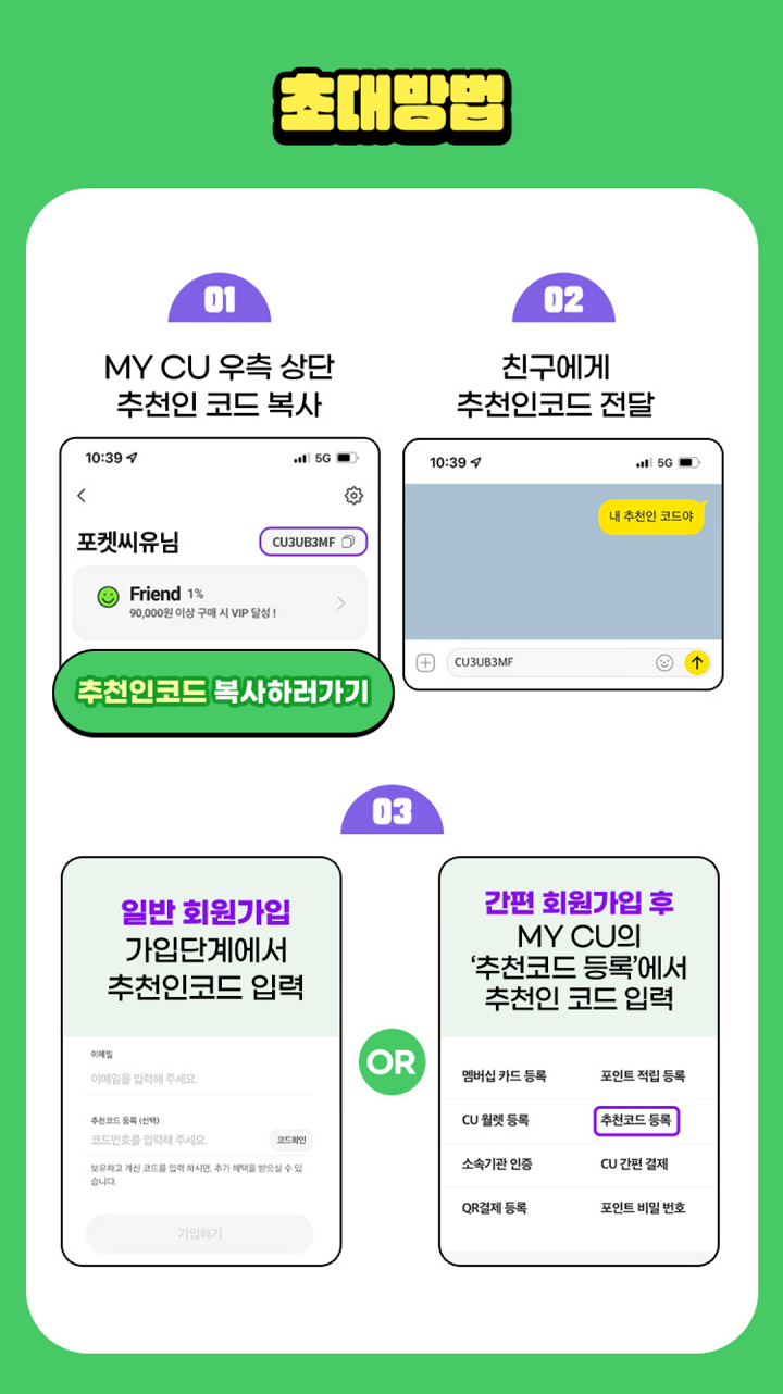 - - 간편 회원 가입시 : 'MY CU > 추천코드 등록'에서 추천인 코드 입력