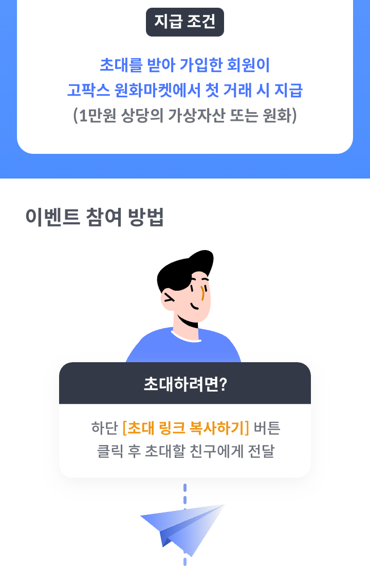 - 초대를 받아 가입한 회원이 고팍스 원화마켓에서 첫 거래 시 지급(1만원 상당의 가상자산 또는 원화)