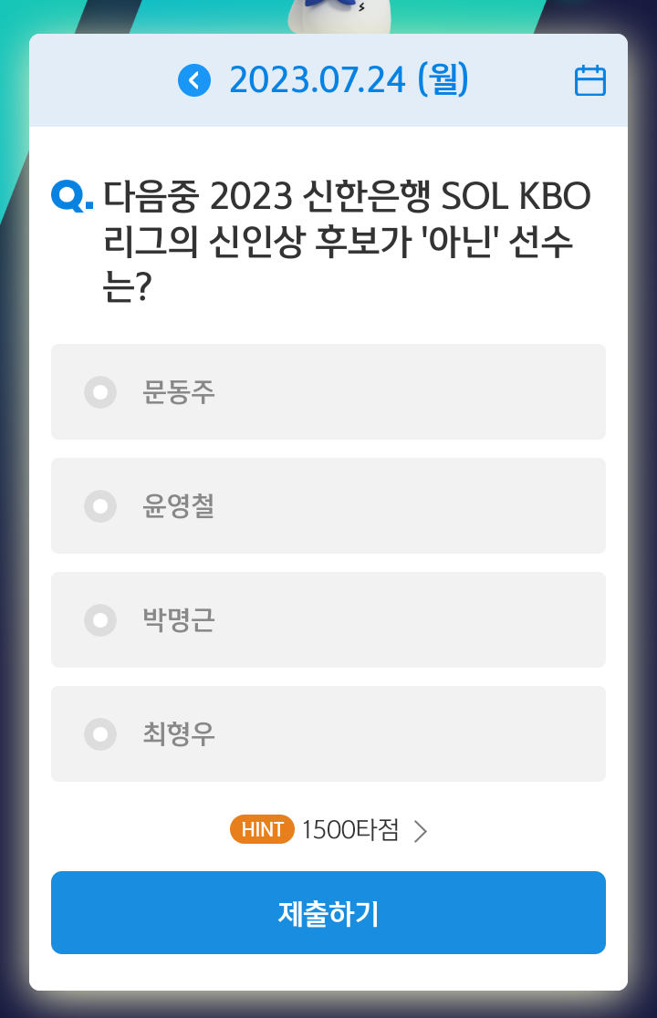 신한쏠, 야구상식 쏠퀴즈(23.07.24), 퀴즈정답, KBO리그의 신인상 후보