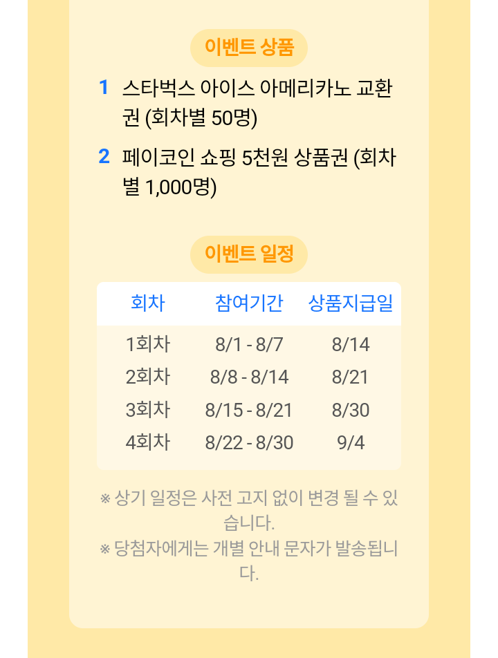 - 회차별 기간 내 1회 이상 페이코인 출석체크 참여