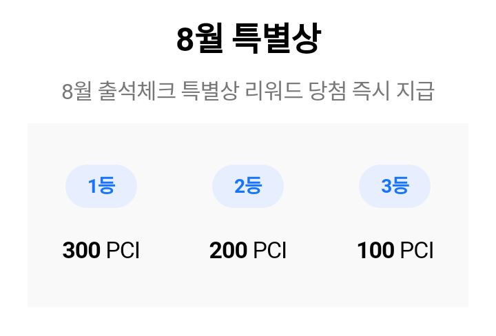 - 개근상 : 무조건! 한 달 개근 시 한 달간 본인이 출석체크 이벤트로 받은 PCI 만큼 지급