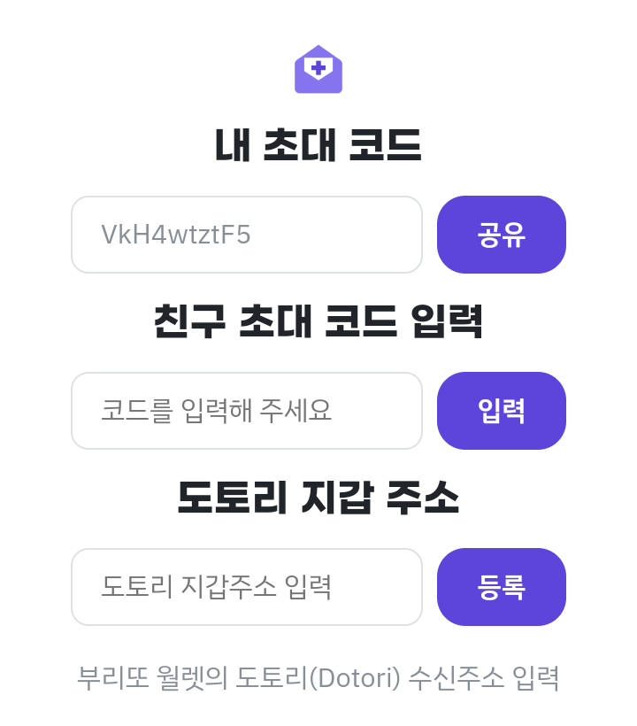 부리또 월렛을 다운로드 받고 기입하한뒤, 친구의 추천코드를 등록하면 도토리 코인(Dotori) 10개가 에어드랍된다. 최대 10회, 100개까지 받을 수 있다.