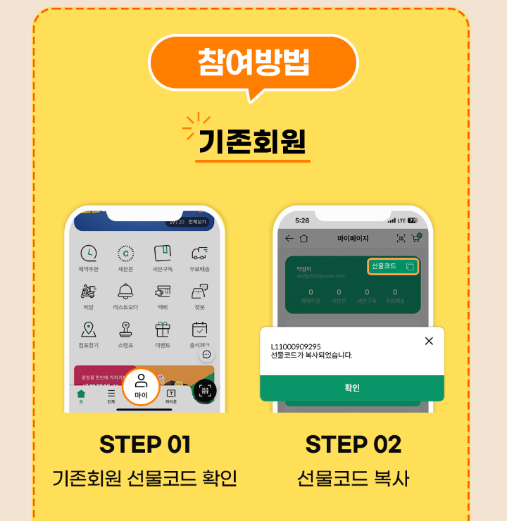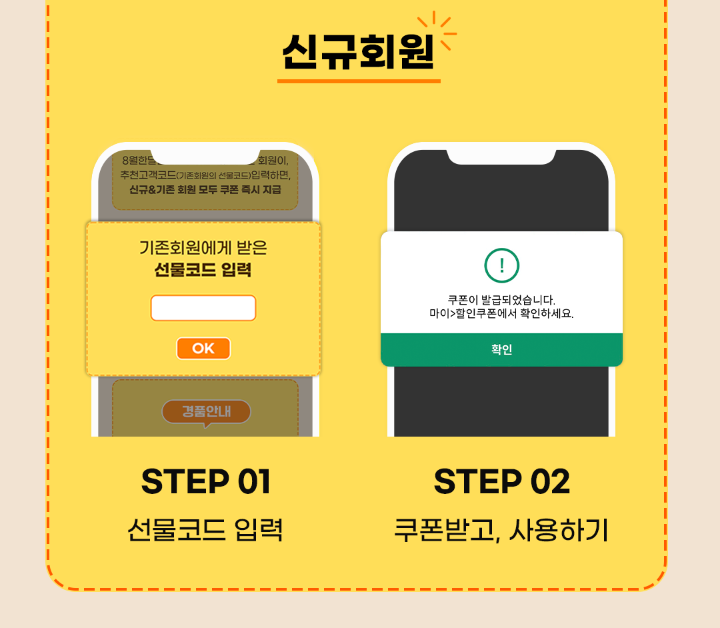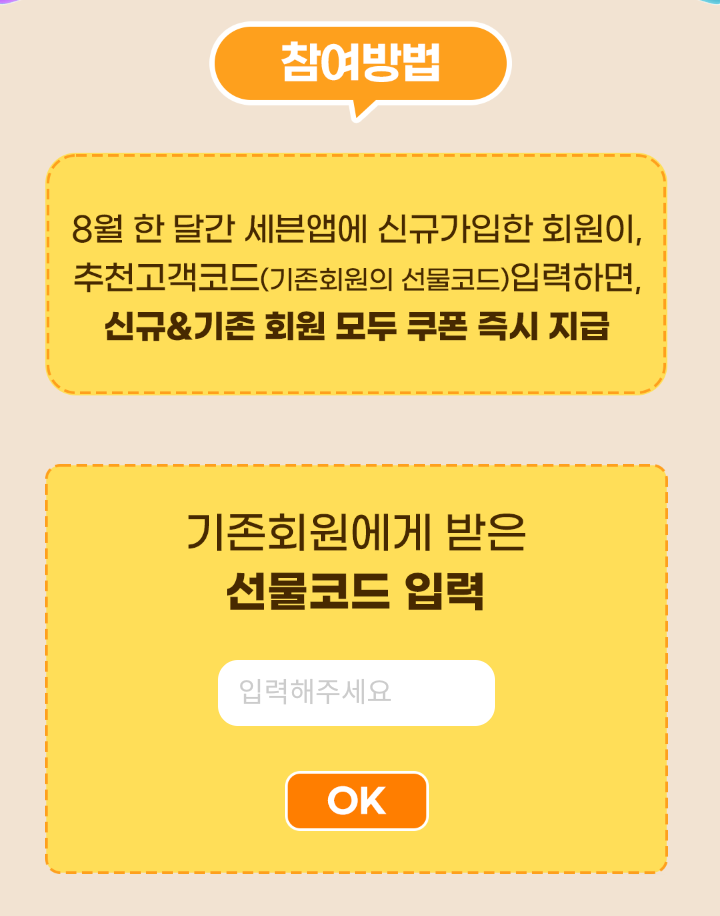 - 8월 한 달간 세븐앱에 신규가입한 회원이 추천고객코드(기존회원의 선물코드) 입력하면 신규&기존 회원 모두 쿠폰 즉시 지급