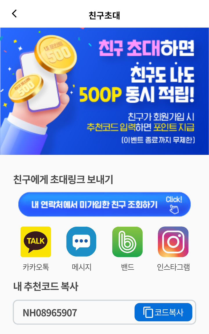 ② NH헬스케어 미가입친구 확인 후 초대장 발송(카톡, 문자, 밴드, 인스타)