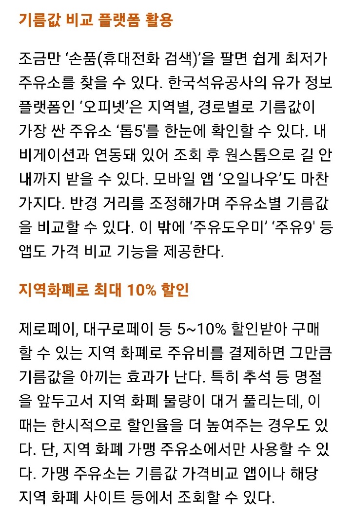 - 제로페이, 대구로페이 등 5~10% 할인받아 구매할 수 있는 지역 화폐로 주유비를 결제하면 그만큼 기름값을 아끼는 효과가 난다. 특히 추석 등 명절을 앞두고서 지역 화폐 물량이 대거 풀리는데, 이때는 한시적으로 할인율을 더 높여주는 경우도 있다. 단, 지역 화폐 가맹 주유소에서만 사용할 수 있다. 가맹 주유소는 기름값 가격비교 앱이나 해당 지역 화폐 사이트 등에서 조회할 수 있다.