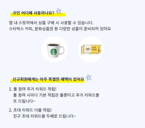 - 앱 내 스토어에서 상품 구매시 사용(스타벅스 커피, 문화상품권 등)