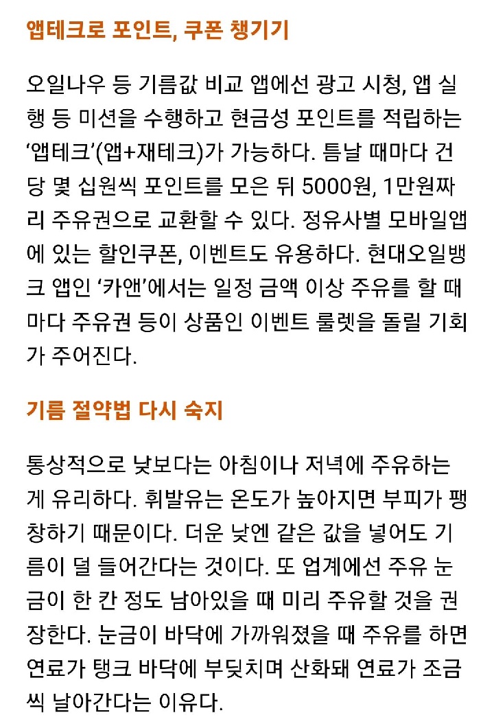 - 오일나우 등 기름값 비교 앱에선 광고 시청, 앱 실행 등 미션을 수행하고 현금성 포인트를 적립하는 ‘앱테크’(앱+재테크)가 가능하다. 틈날 때마다 건당 몇 십원씩 포인트를 모은 뒤 5000원, 1만원짜리 주유권으로 교환할 수 있다. 정유사별 모바일앱에 있는 할인쿠폰, 이벤트도 유용하다. 현대오일뱅크 앱인 ‘카앤’에서는 일정 금액 이상 주유를 할 때마다 주유권 등이 상품인 이벤트 룰렛을 돌릴 기회가 주어진다.